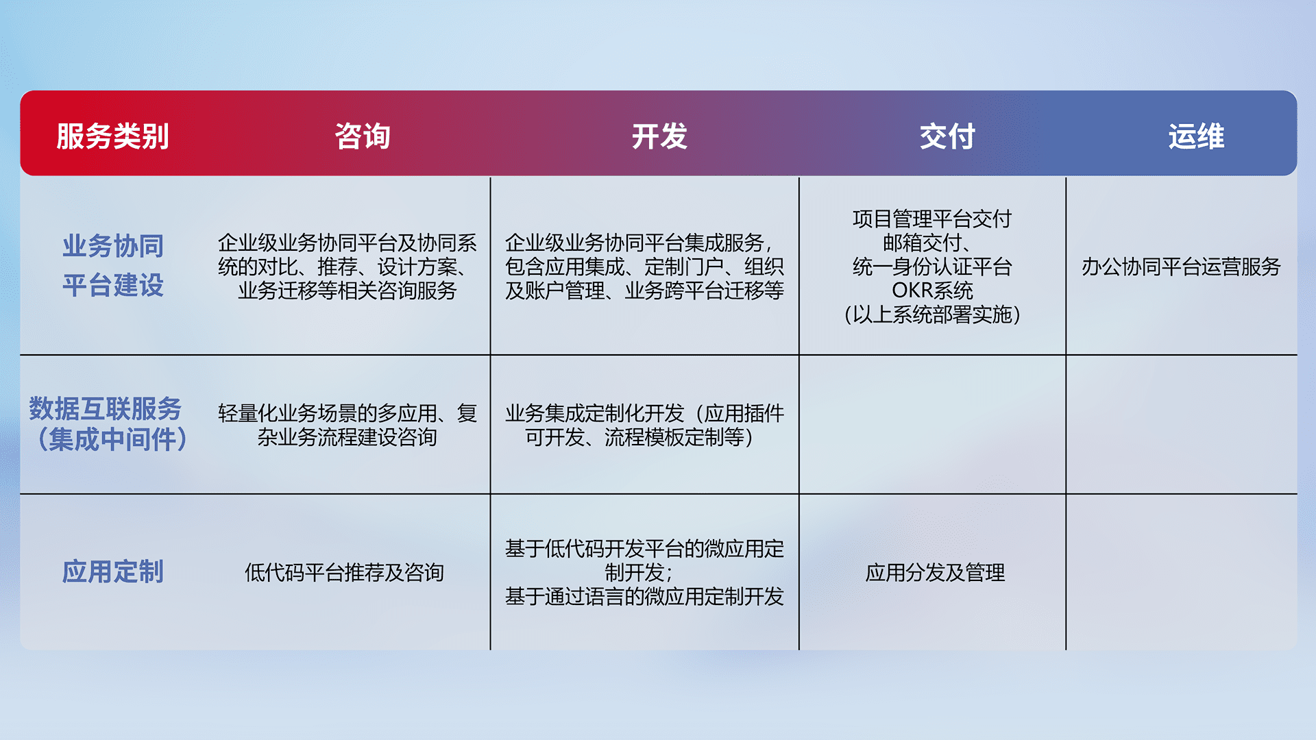 针对钉钉、、、、企微、、IDaas等平台级产品提供产品的规划、、、方案、、交付、、定制化开发等服务,,,实现如统一协同办公、、智能客户服务、、、、混合会议管理、、、智能数据查询、、、等业务场景,,,实现数字化转型。。